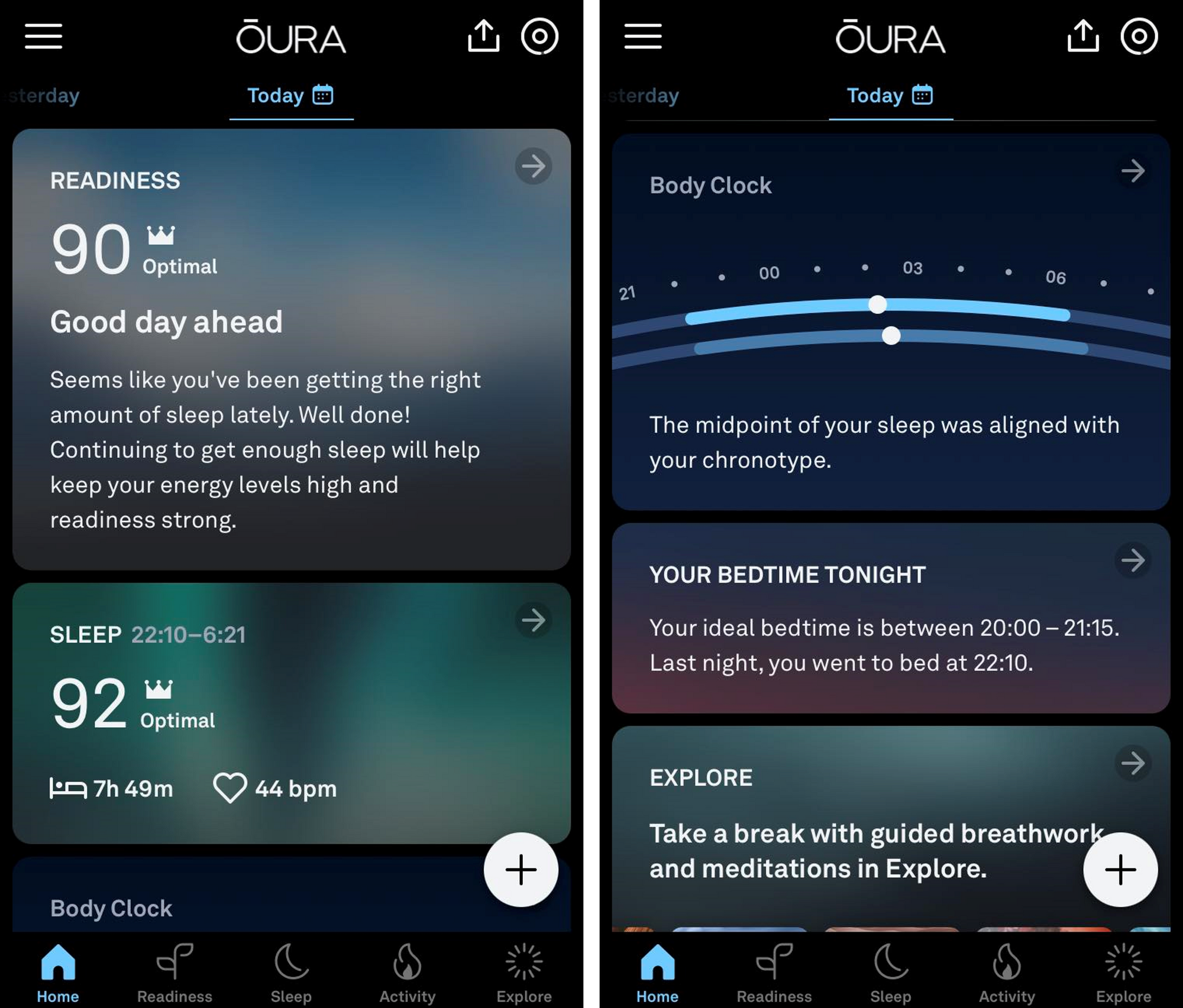 - Oura - v rámci záložky Explore nabízí typy Meditate, Breathe a Sleep. Tato cvičení aktivují záznam dat z prstenu, detail záznamu závisí na jeho délce.