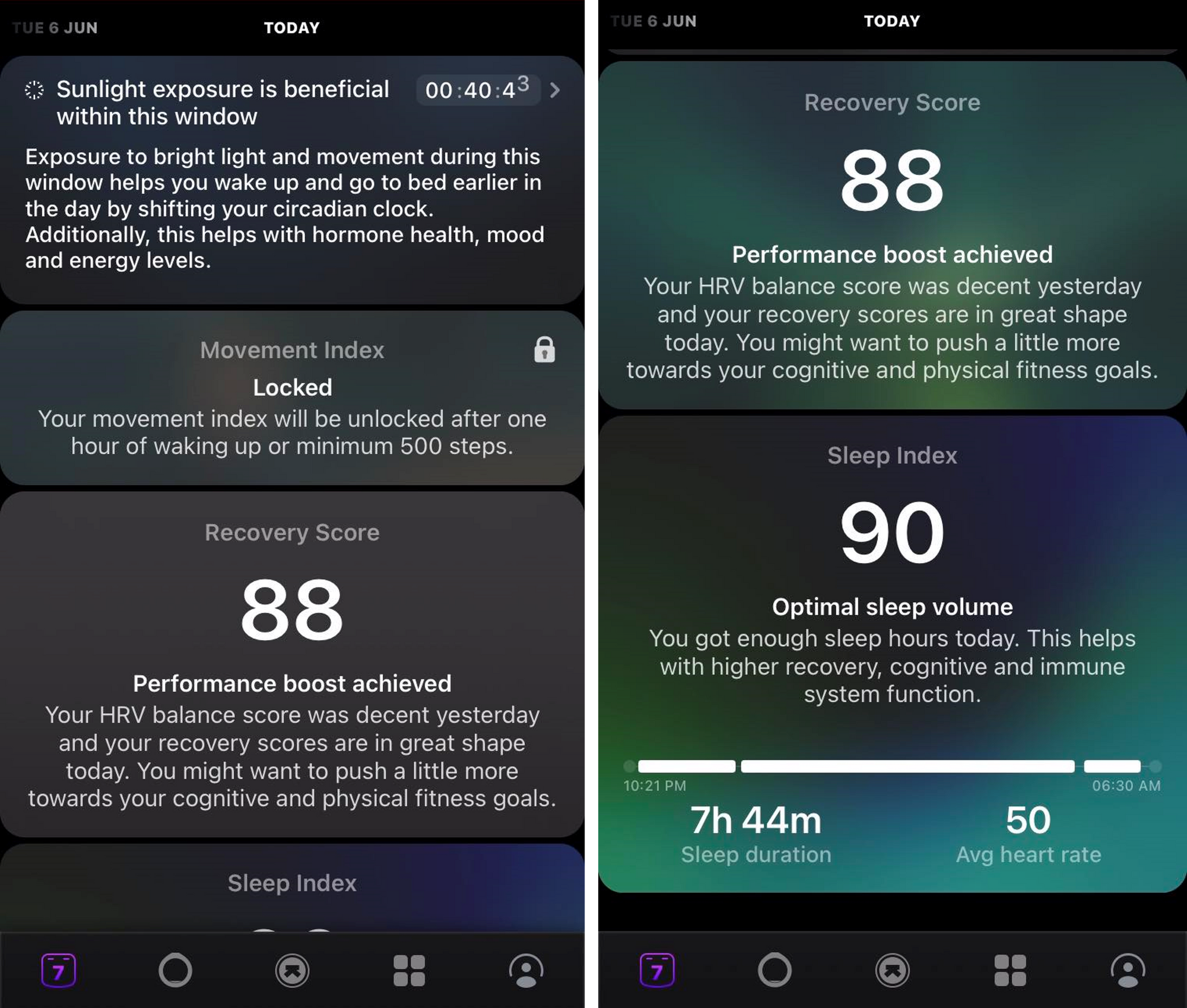 Ústřední ranní metrikou je zde Recovery Score, který je velmi podobným Readiness Oury. Zde jsem obdržel skóre 88 s tím, že hodnoty HRV jsou v normě a mohu se bez bázně pustit do prolomení mých kognitivních a fyzických limitů.