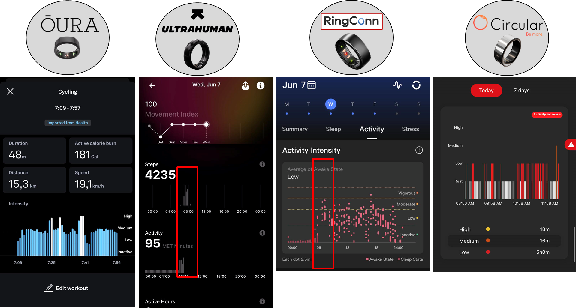 Pokud bych to zhodnotil, tak aktivitu jako takovou zaznamená pouze Oura - která následně použila data z externího zdroje, Ultrahuman zaznamená aktivitu v jednotkách MET, RingConn zaznamenal jistou intenzitu. Circular v tomto ohledu selhal, nicméně si myslím, že bylo způsobené zmiňovaným výpadkem.