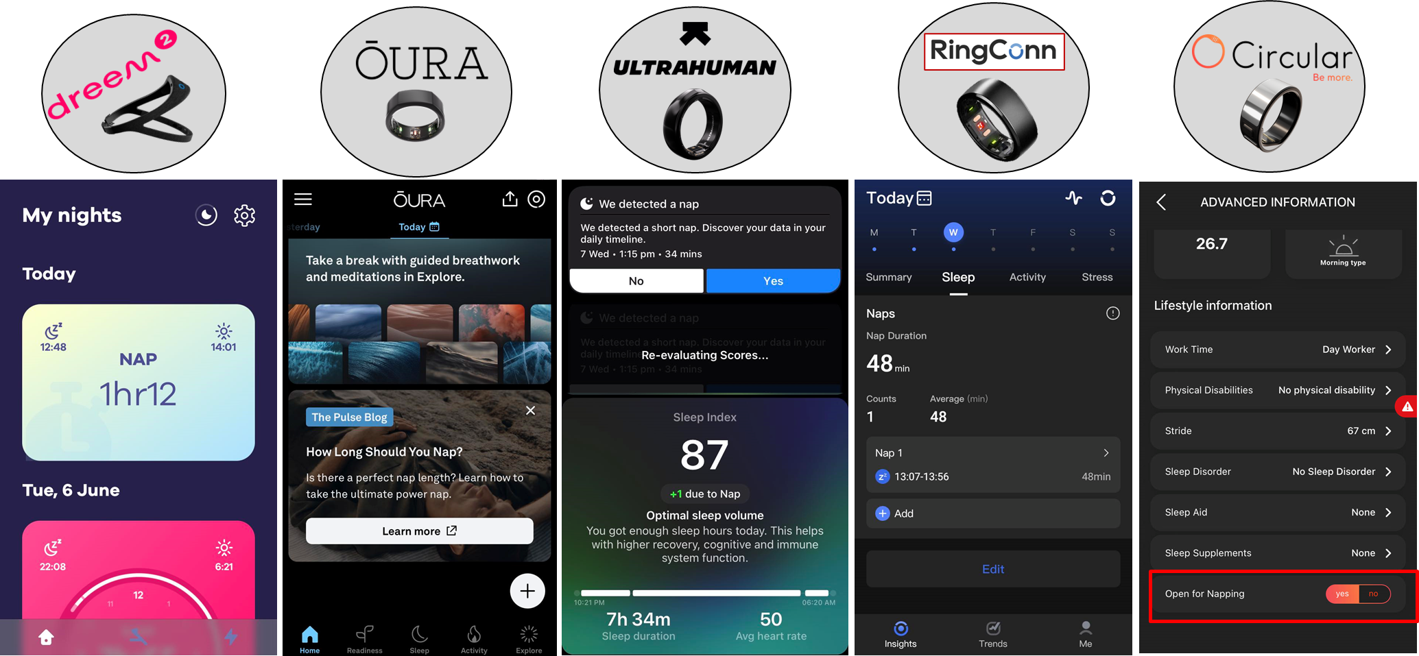 - Ultrahuman - detekuje šlofík poměrně spolehlivě, nicméně z mojí zkušenosti v některých případech detekuje i část spánku jako nap (např. část spánku 21-23.00, když jdete ve 23.00 na toaletu). Šlofík se následně započítá do spánkového skóre.
