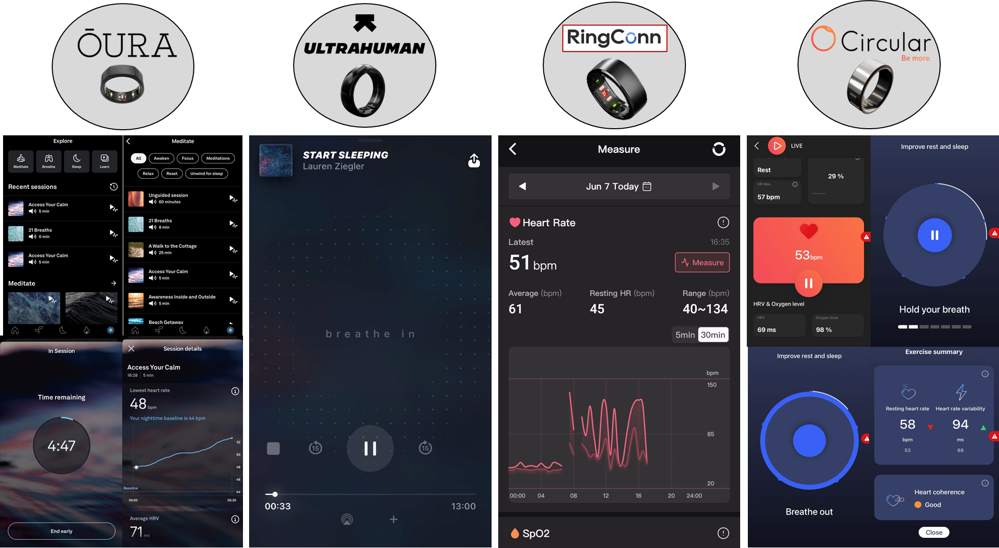 Meditační cvičení v aplikaci nabízí Oura, Ultrahuman a Circular. RingConn umožňuje "pouze" živé měření. Větší detail uvedu zde: