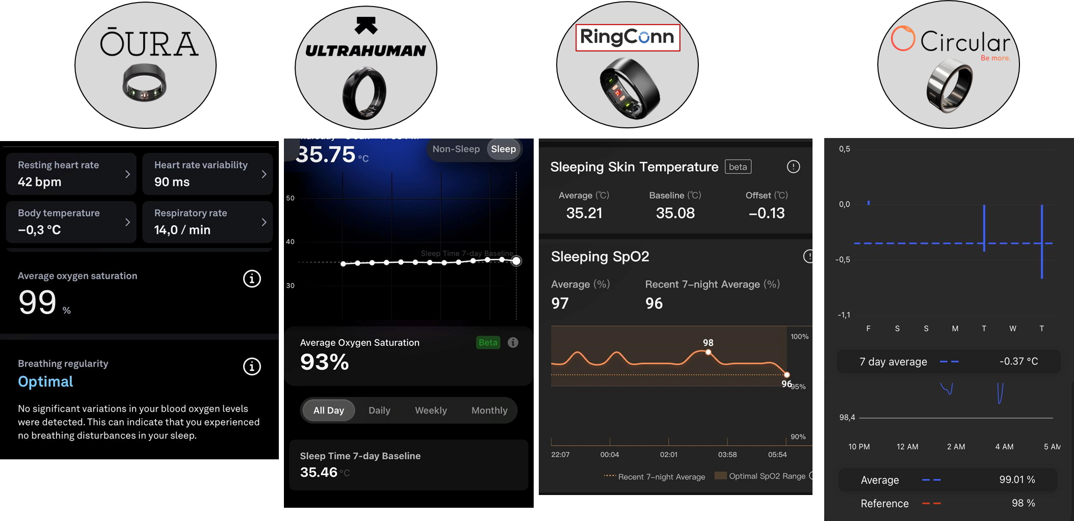 K teplotě a SPO2 nemám žádné referenční hodnoty, ale ze zkušenosti věřím teplotní variaci Oury. Zobrazení absolutních hodnot v případě Ultrahuman a RingConn je zajímavé, nicméně mnoho neříkající, je nutné se podívat k baseline a k jí vztahovat.