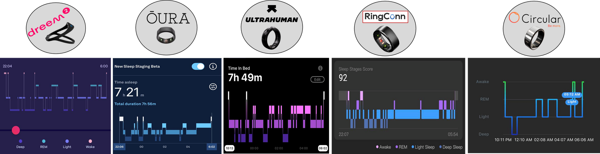 Referenční zařízení Dreem2 a hrudní pás naměřily shodně HR 45 bpm, HRV pak 91 ms. Pokud bych měl na základě této jedné noci seřadit prsteny podle přenosti bylo by to takto: