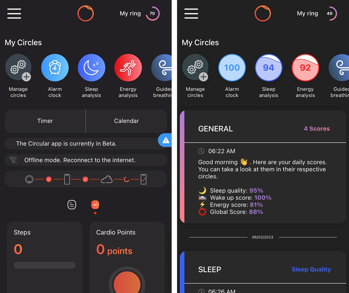 - V rámci Oury (samozřejmě v rámci předplatného) a Ultrahuman (kde je s prstenem de facto doživotní předplatné) je k dispozici databanka různých cvičení, meditací apod. Oura navíc dovede měřit tělesné metriky v průběhu takových seancí. RingConn a Circular umožňují živé měření, Circular navíc dechové cvičení doprovázené vibracemi prstenu.