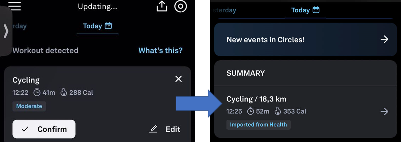 V rámci tohoto testování jsem však zjistil, že Oura nově nevyžaduje konfirmaci aktivity z AAD, pokud jí jiný zdroj, např. iOS Health (potažmo např. Garmin) aktivitu validuje importem. Tuto teorii jsem si potvrdil v další aktivitě cyklistiky.