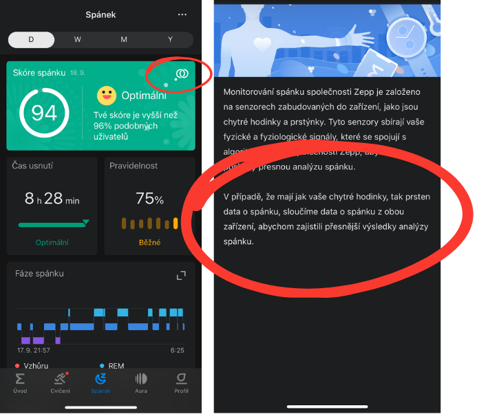 Pokud budete obě zařízení nosit zároveň, budete mít jistotu nejpřesnějších dat. To uvádí aplikace i pro užití hodinek a prstenu při spánku.