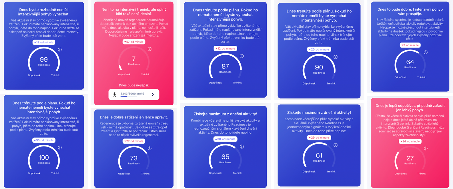 Níže pro ilustraci spektrum doporučení Readiness, které mi Elonga nabízela pro jednotlivé dny v průběhu testování: