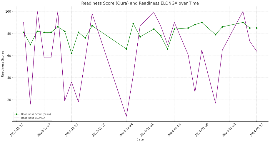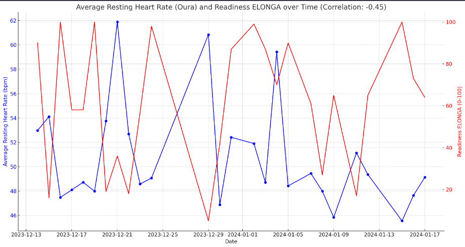 Nebo např. možnou vazbu nočního Resting Heart Rate z Oury a Readiness Elongy.