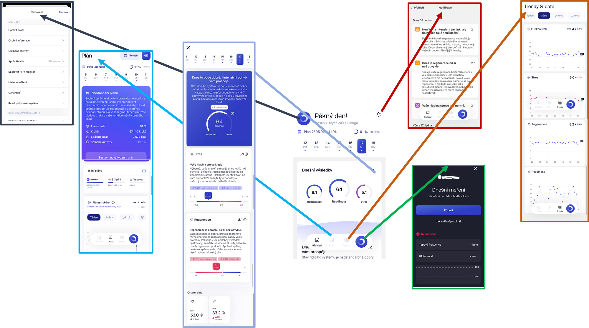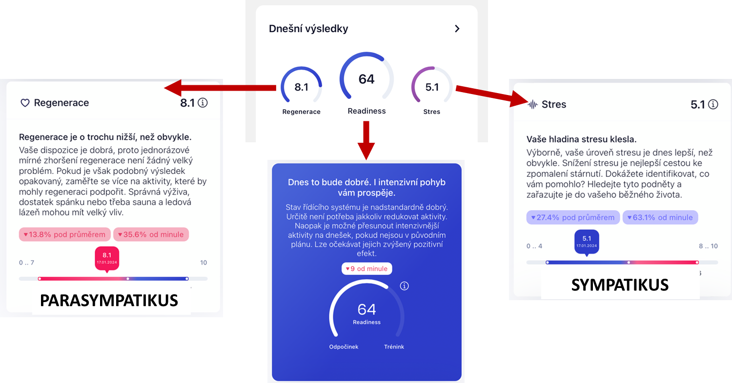 Na základě ranního měření (jehož koncept jsem popsal výše) dostanete výsledky pro daný den na ústřední obrazovce "Přehled" a více v prokliku do "Dnešní výsledky":