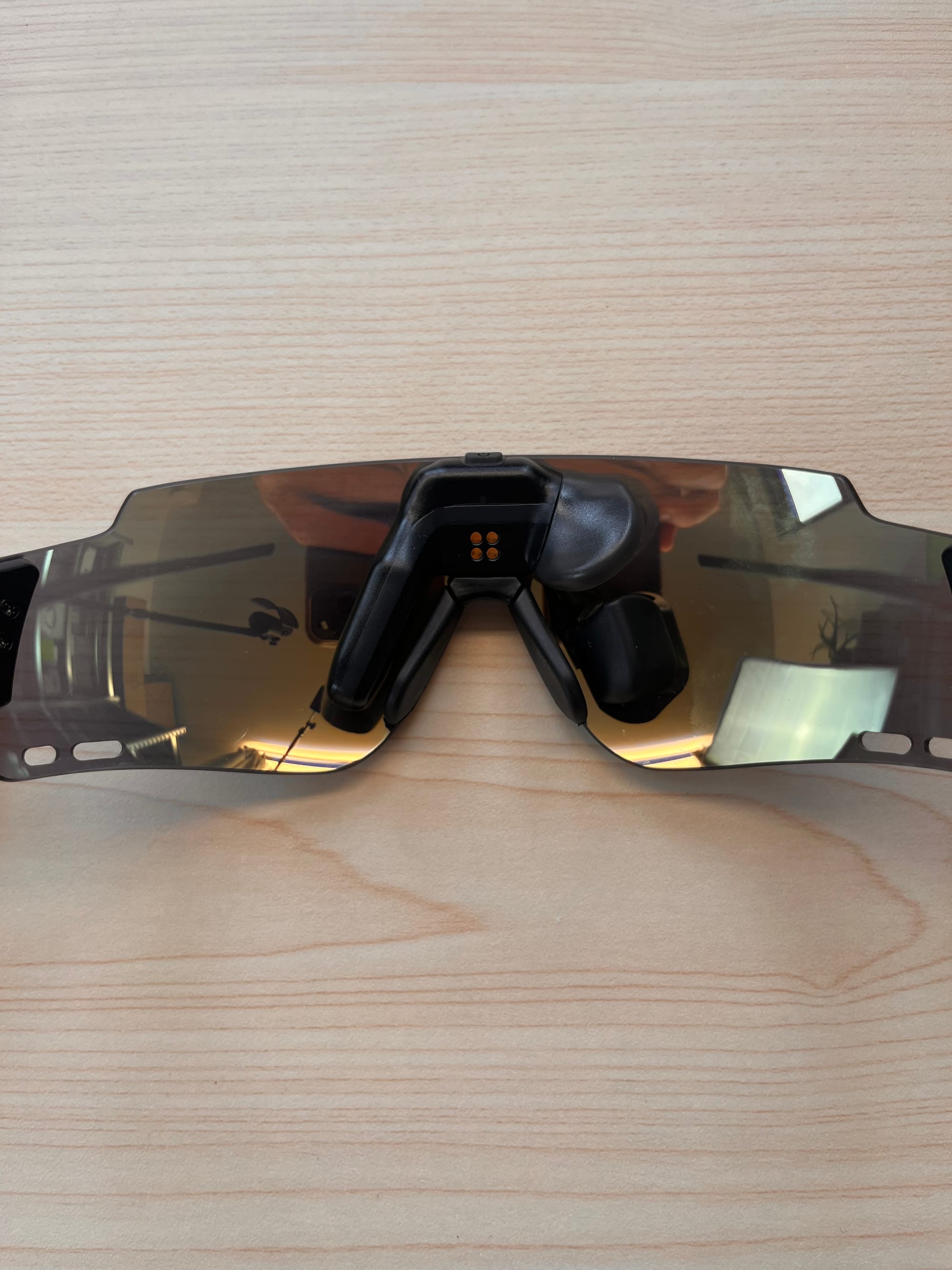Ten zmíněný středový modul je to, co dělá tyto brýle chytrými. Obsahuje baterii, nabíjecí piny (speciální typ konektoru), senzor okolního světla, BLE modul, senzor na gesta a samozřejmě projekční modul, který de facto představuje tzv. HUD - Heads-up displej.