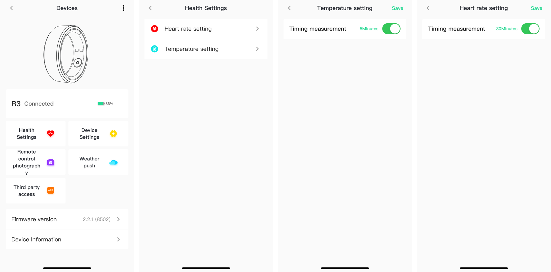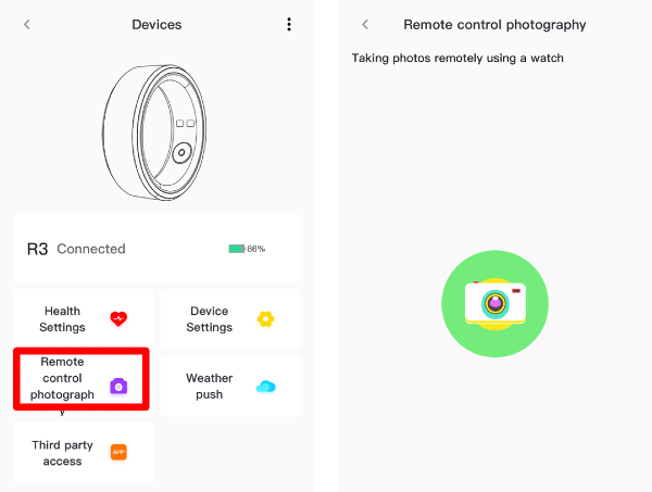 - Jak jsem již zmínil, aplikace je univerzální a slouží vícero zařízení, tedy např. i chytrým hodinkám. Není však zcela domyšlená. Jeden příklad. Přes nastavení chytrého prstenu se lze dostat do možnosti "Remote control photography", tedy, že pořídíte snímek skrze zařízení (hodinky). To samozřejmě nedává smysl, neboť prsten R3 nemá žádný ovládací prvek.