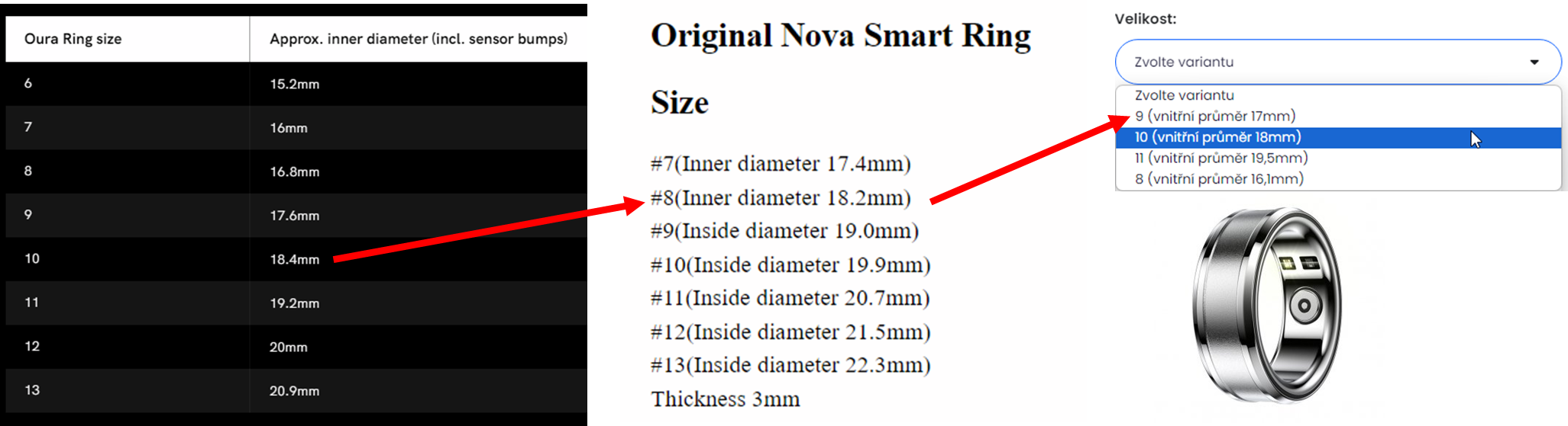 Můj postup byl trochu komplikovaný. Inspiroval jsem se u výběru Nova Ring, který mi sedne na prsteníček. Nakonec jsem objednal velikost 9, která sedne na prsteníček a těsněji i na ukazováček.