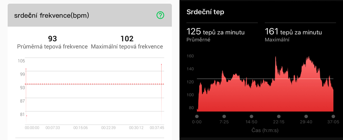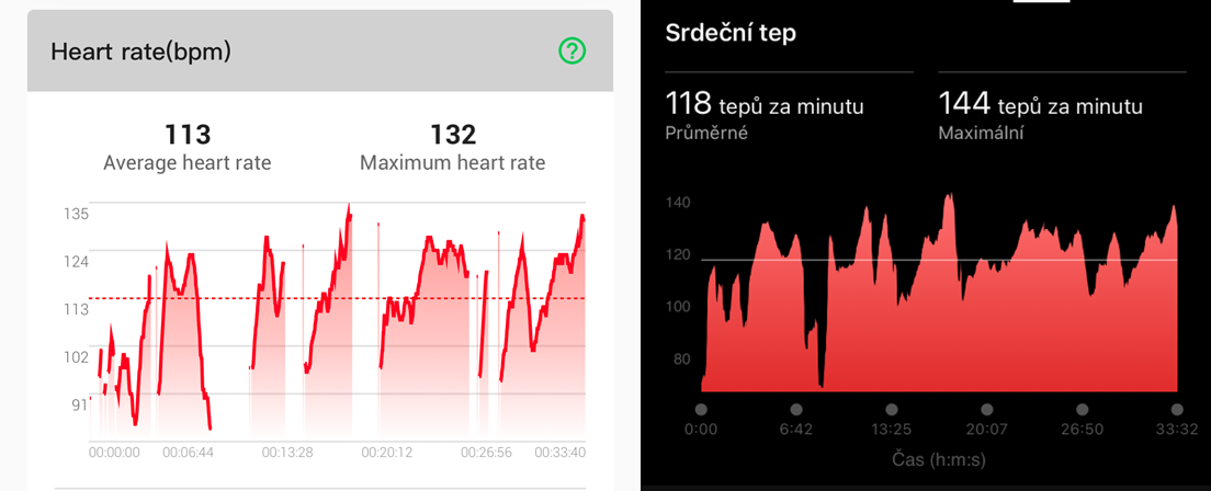 V prvním testu došlo k několika výpadkům. Z křivky a porovnání s Garmin hodinkami je však patrné, že R3 zachytilo několik peaků a propadů velmi podobně.