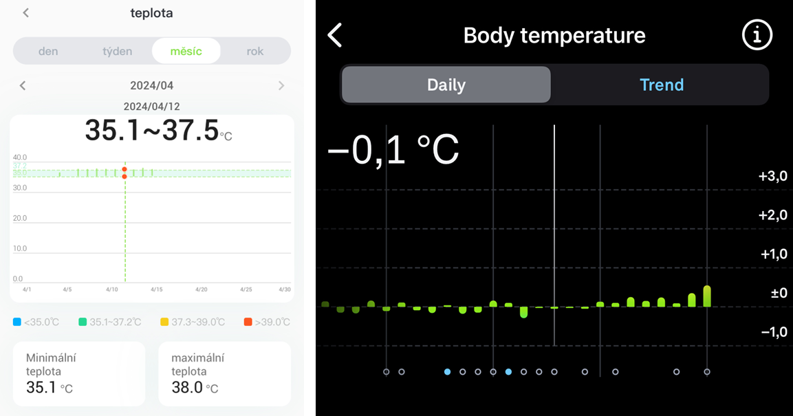 Prsten je vybaven také teploměrem, který se v aplikaci promítá jako číslo v absolutní hodnotě, nikoliv jako odchylka od baseline (průměrné hodnoty).