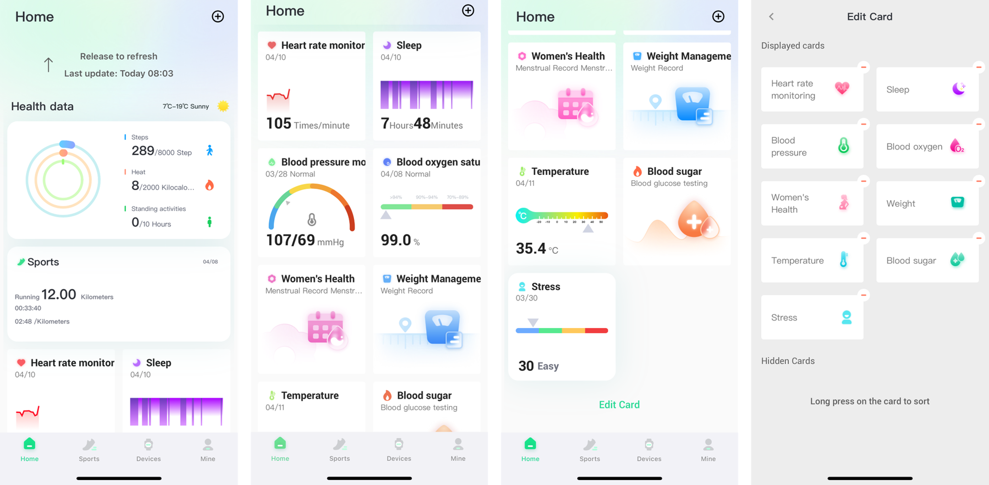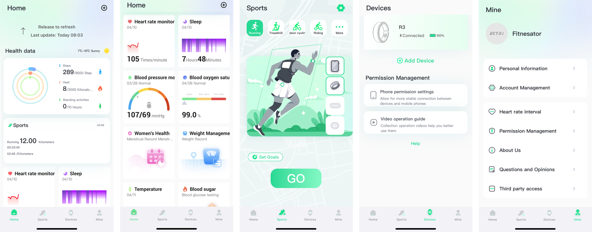 Tato aplikace je do jisté míry univerzální, neboť není dedikována pouze prstenu, ale i dalšímu příslušenství (hodinky/náramek, hrudní HR monitor...). Níže náhled na základní obrazovky aplikace, konkrétně do záložek Home-Sports-Devices-Mine: