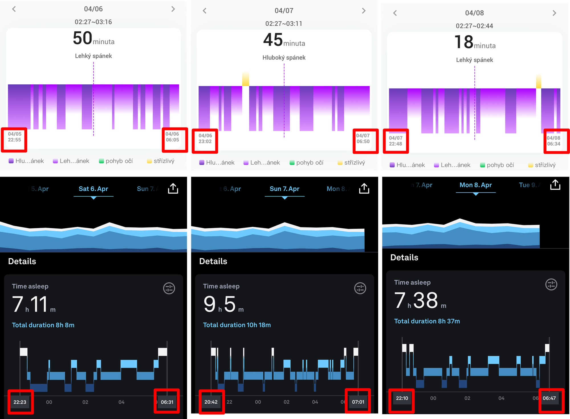 - Spánková data je potřeba brát v této cenové kategorii s velkou rezervou. Na jednotlivé spánkové fáze se asi netřeba ani dívat (nehledě na to, že hypnogram je extrémně nepřehledný), R3 má problém velký zachytit začátek spánku, doba probuzení je o trochu lepší, více viz porovnání 3 nocí (R3 vs Oura ring)