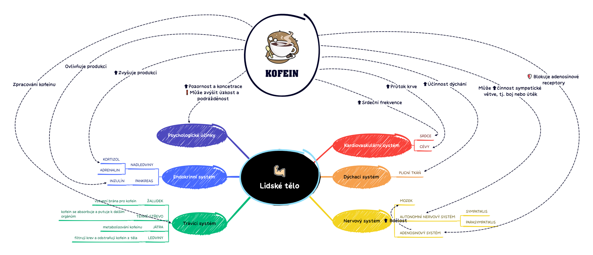 Jak již bylo řečeno, káva, respektive kofein je stimulant. To znamená, že stimuluje, tedy ovlivňuje, celou řadu pochodů v lidské těle. Ty nejzásadnější prvky těla, které kofein ovlivňuje, pokrývá myšlenková mapa níže: