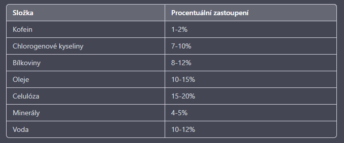 Klíčové složky kávy jsou chlorogenové kyseliny - to jsou polyfenolické sloučeniny, které obsahují ty bájné a prospěšné antioxidanty a také jsou tyto kyseliny zodpovědné za typickou hořkou chuť kávy. Dále se jedná zejména o kofein, který je sice zastoupen v kávě pouze v 1-2%, nicméně jeho účinky na lidské tělo jsou signifikantní.