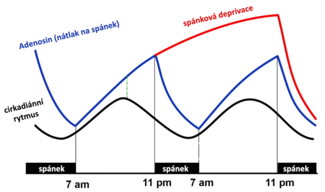 - Adenosin - biomolekula, neurotransmiter , hladina adenosinu se v těle mění v průběhu dne a způsobuje tak tzv. sleep pressure (tedy "nátlak na spánek"), což ilustruje tato křivka: