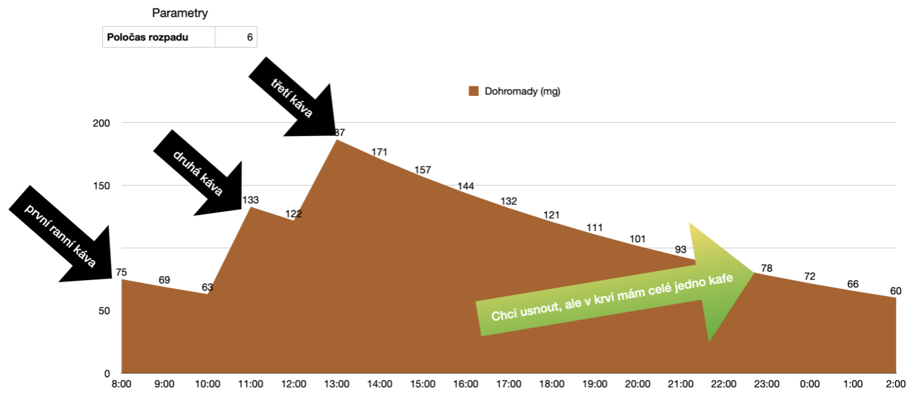Pravidlo o poslední kávě vedlo ale k nechtěnému chování. Měl jsem pocit, že prostě stačí, že "stihnu" všechny svoje kávy do 14, respektive, do 12:00. Zde v mé úvaze absentovala jednoduchá aritmetika. Tedy, že kofein se samozřejmě v těle s dalšími vypitými šálky kávy kaskádově sčítá (a zároveň pomalu metabolizuje).