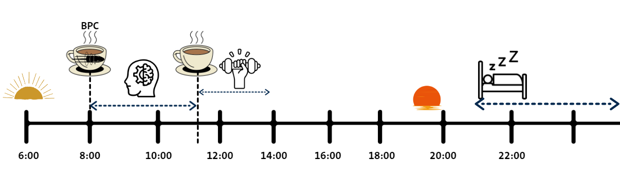 Pro načasování se v první řadě řiďme poločasem rozpadu. Ten je individuální, nicméně pro většinovou populaci použijme 6 hodin. To znamená, že po 6 hodinách od konzumace kávy má průměrný jedinec ještě polovinu obsahu kofeinu kávy.
