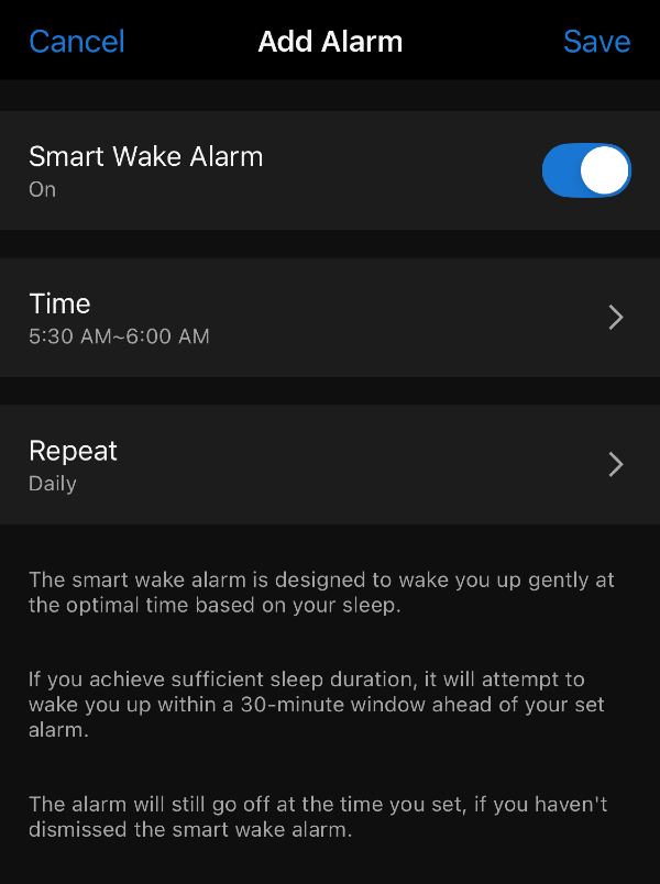 Můžete nastavit v jakém 30-minutovém okně chcete vzbudit - to se děje volbou nejzazšího času, kdy má zařízení vibrovat. Lze také měnit sílu vibrací.