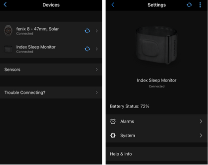 Ve zkratce, u Index Sleep funguje obdobně jako u Fenix 8, s tím rozdílem, že nastavení probíhá výhradně přes aplikaci.