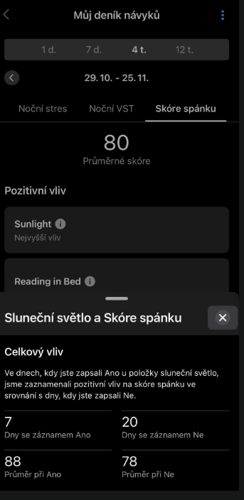 Že mám nižší skóre spánku při nemoci, to je jasné. Ale že ve dnech, kdy trávím výrazné množství času na denním světle, bude změna skóre tak markantní, to jsem opravdu nečekal.