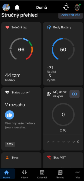 Stojí za zmínku, že pokud máte Venu 4 nebo Fenix 8 (což já nemám — mám F7 Pro), tak se vám Status zdraví zobrazuje přímo na hodinkách, bez nutnosti synchronizace s aplikací.