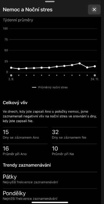 Nedávno se mi to stalo znovu a musím říct, že i během nemoci mi aplikace skvěle ukazovala průběh. Podle údajů jsem dokázal posoudit: