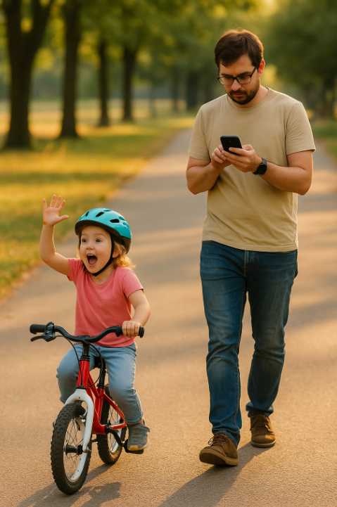 Před týdnem jdu z práce a vidím tatínka s holčičkou. Dítě jede na kole a křičí: „Tati, dívej, dívej, dívej!“ Tatínek jde za ní a říká: „Jojo, já tě vidím,“ ale kouká do mobilu. Čekám, že zvedne hlavu a poběží za ní… Ne. Pokračuje ve „strašně důležité“ věci v telefonu. Vím, že to zní sentimentálně, ale je to realita.