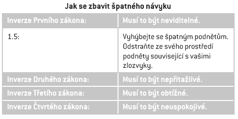 Jsem ten, co nezůstane po otevření čokolády u jednoho čtverečku. Nic proti kvalitní čokoládě. Vezmu jiný příklad. Pokud chci mít jistotu, že nebudu konzumovat junk-food, tak si ho nekoupím. Tedy, ve jménu "atomových návyků", návod, jak prolomit zlozvyk, je: udělat ho v první řadě NEVIDITELNÝ, dále pak NEATRAKTIVNÍ, OBTÍŽNÝ A NEUSPOKOJIVÝ.