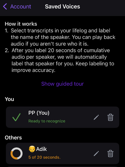 Prvotní nastavení aplikace Limitless je rychlé – spárování, update firmwaru, následně se mě appka zeptala, zda mě může notifikovat a trochu mě zaškolila. Význačné také bylo to, že se appka naučila rozpoznat můj hlas prostřednictvím přečtení tří odstavců v angličtině.