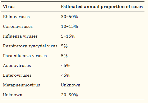 5) Nejčastější je nákaza rhinovirem (30-50 %) [3], viz níže