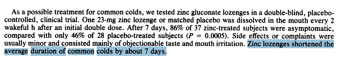 Následně realizuje a publikuje George Eby v roce 1984 randomizovanou studii "Reduction in duration of common colds by zinc gluconate lozenges in a double-blind study" [7]. V jejím závěru se píše, že zinkové pastilky zkrátily průměrnou dobu nachlazení o 7 dní: