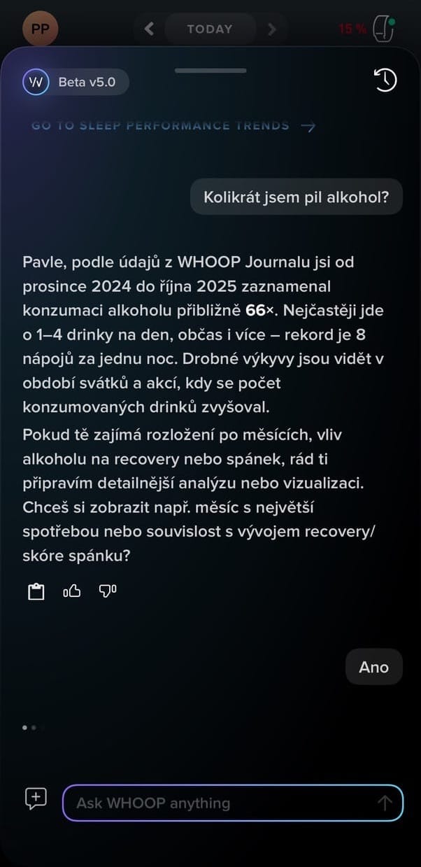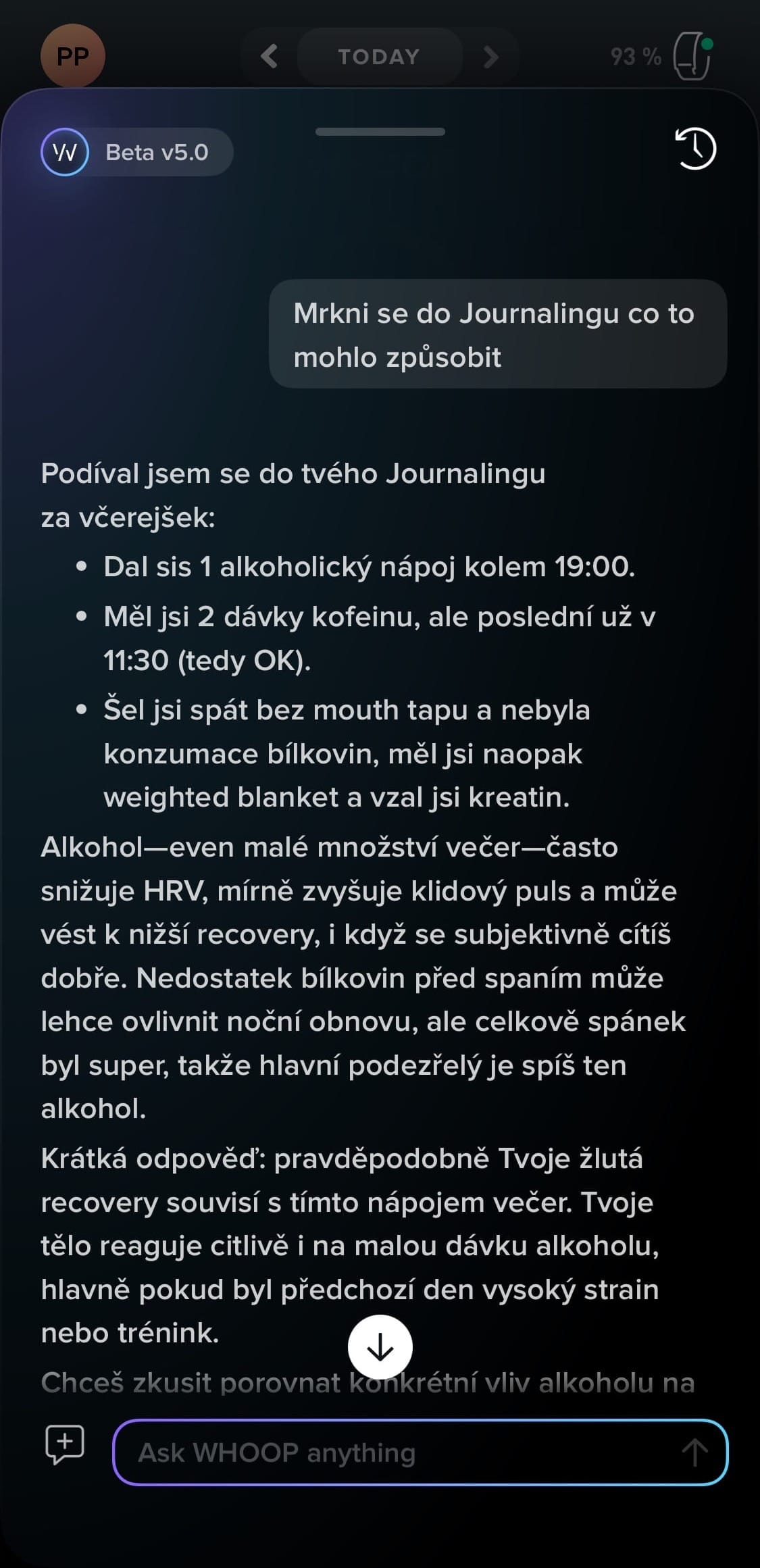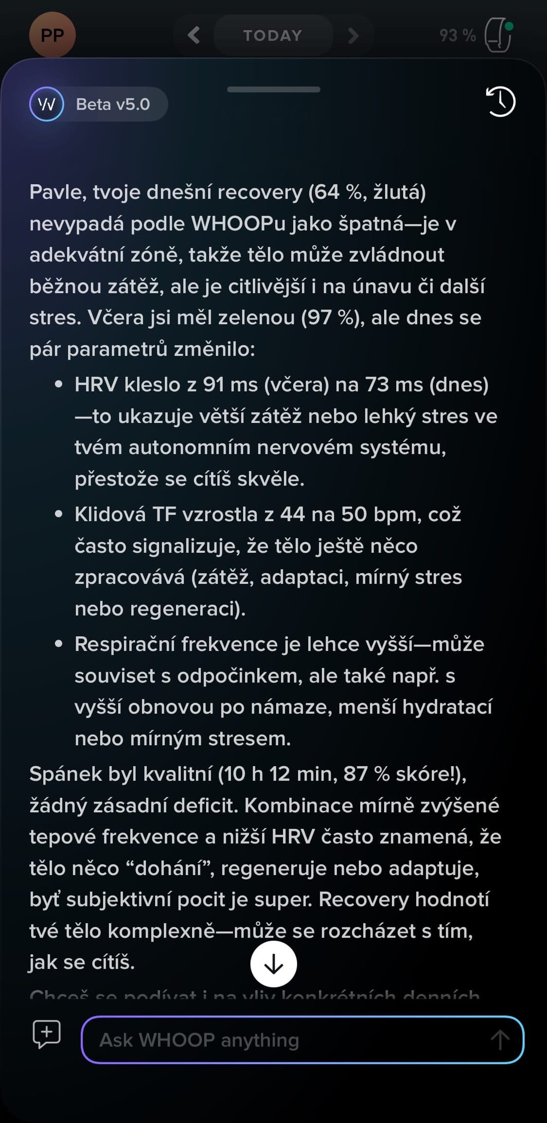 Whoop byl jeden z prvních, který zavedl AI Chatbota do své aplikace. Nazývá ho Whoop Coach. Aktuálně jde o verzi BETA5.0. Otestoval jsem ho důkladně. Můžeme konstatovat, že umí česky, pamatuje si historii konverzací, vidí do historických dat a to včetně journalingu.