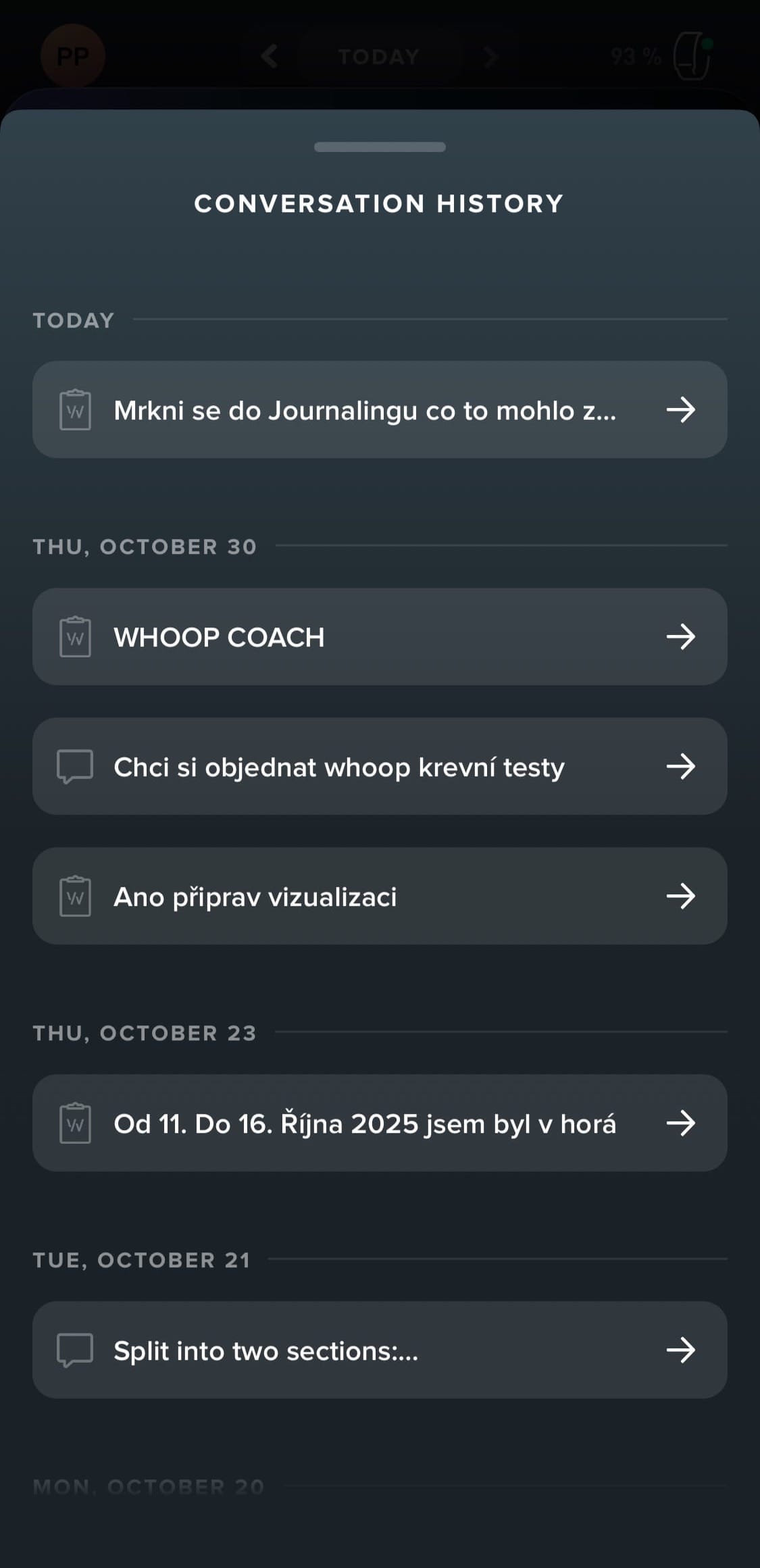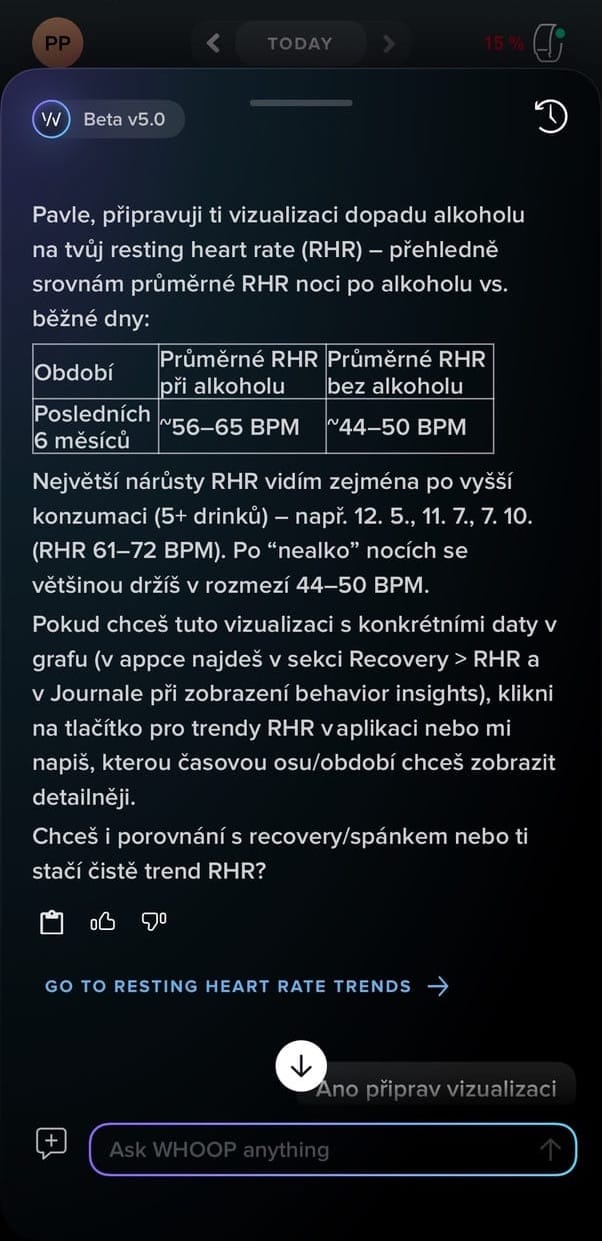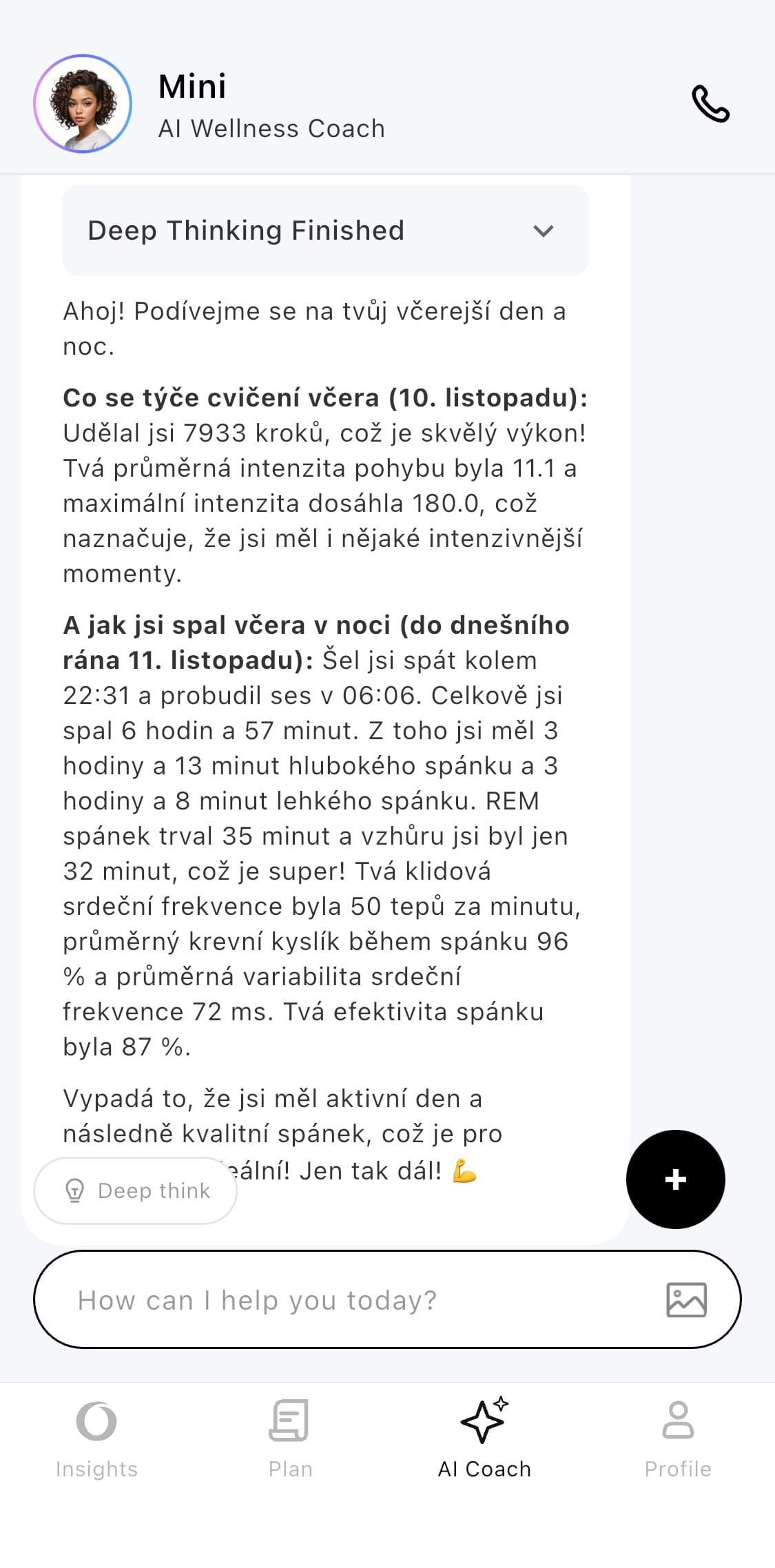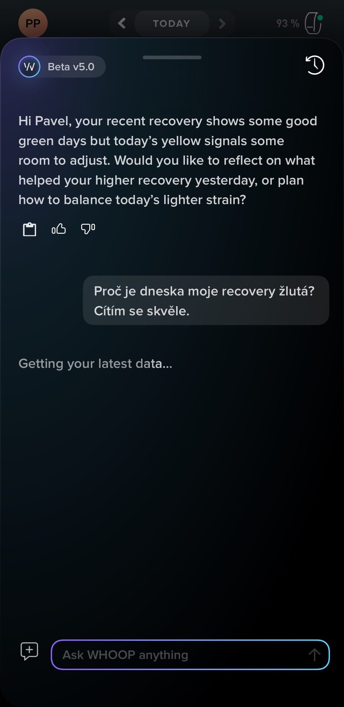 Whoop byl jeden z prvních, který zavedl AI Chatbota do své aplikace. Nazývá ho Whoop Coach. Aktuálně jde o verzi BETA5.0. Otestoval jsem ho důkladně. Můžeme konstatovat, že umí česky, pamatuje si historii konverzací, vidí do historických dat a to včetně journalingu.