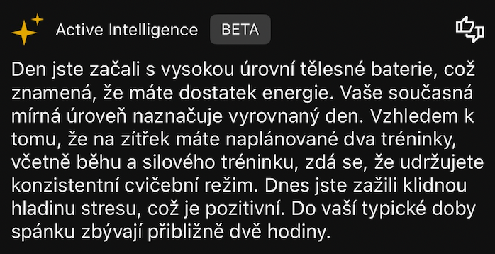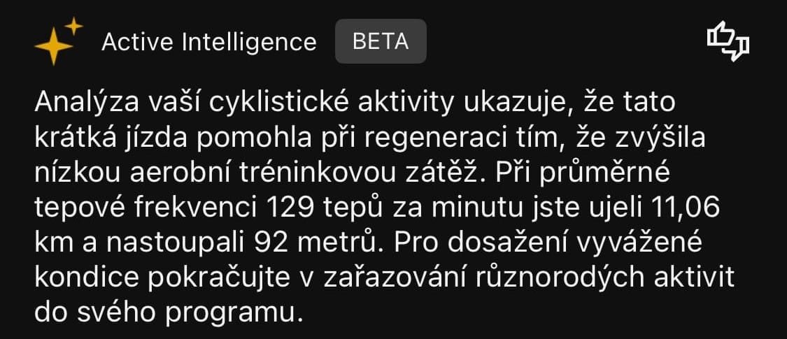 Garmin Active Intelligence totiž zatím působí spíš jako komentátor než skutečná umělá inteligence. Umí hezky shrnout, jak se vám dařilo při tréninku, kolik máte energie nebo že je čas na regeneraci, ale nepřináší žádné hlubší poznatky ani personalizované rady. Spíš překládá data z Garmin Connectu do lidské řeči – což je příjemné, ale za funkci v předplatném by uživatelé možná čekali víc než jen chválícího asistenta.