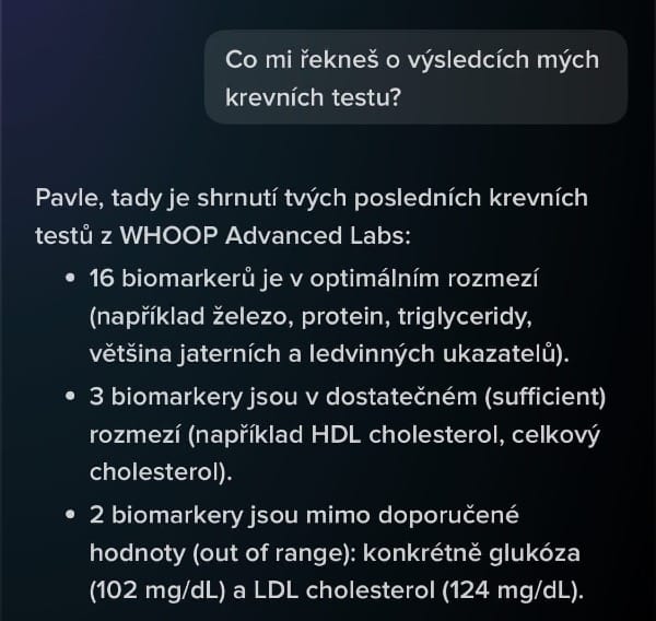 Aktuálně také Whoop následuje nový trend – propojení dat z nositelniky a krevních testů, zatím dostupné pouze v USA. Nicméně může jít o zajímavý díl do skládačky pro LLM.