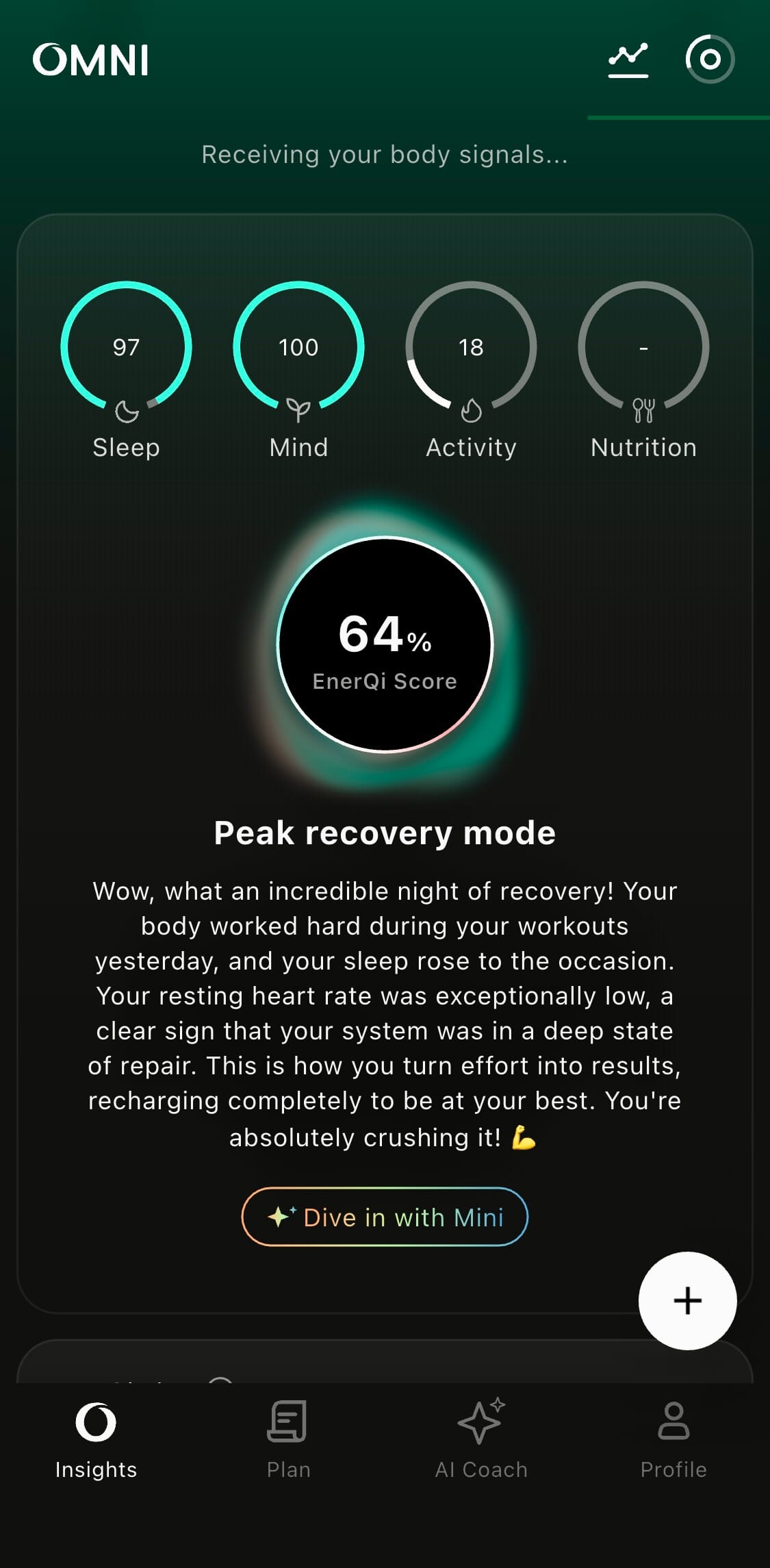 Nedávno 📦 Rozbalení Omni Ring – "AI nutriční" prsten s překvapivými rozměry na AI hodně sází, a proto jej zde musím také zařadit. AI lze najít hned v několika funkcionalitách, ve slovním hodnocení EnerQi Score, ve kterém se můžete následně ponořit hlouběji v rámci "Dive in with Mini", což je chatbot s podtitulem AI Wellness Coach. A co víc! Dokonce si můžete s Mini povídat (anglicky). To je zatím na poli nositelky unikátní.