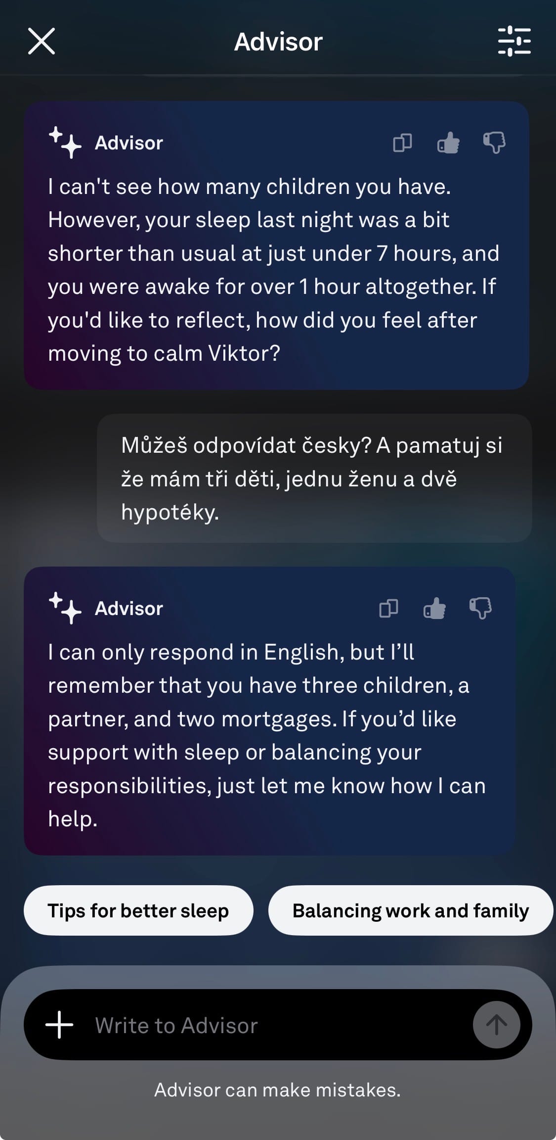 - Oura Advisor – Chatbot s pamětí a určitými limity (vidí data jen za posledních 7 dní). Aktuálně jsem ho nepřinutil odpovídat česky.