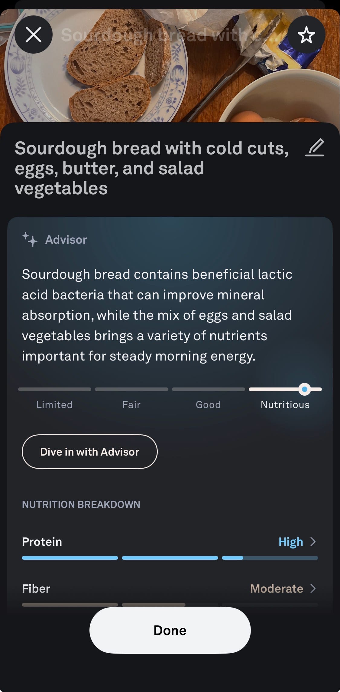 Dále je AI také součástí Plan – kde je možné si vyfotit jídlo a nechat jej analyzovat (zde najdeme částečnou podobnost s Oura Meals).