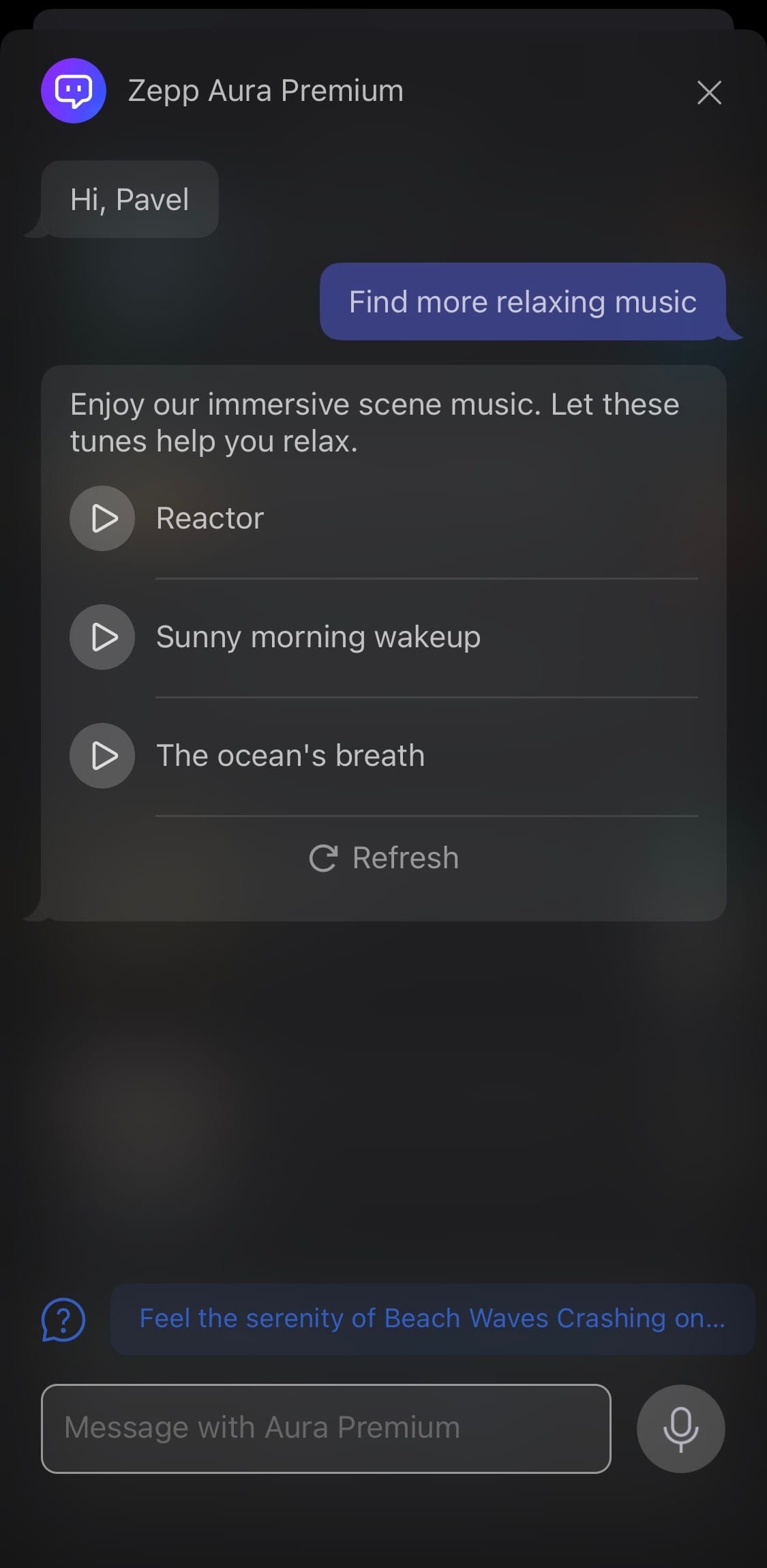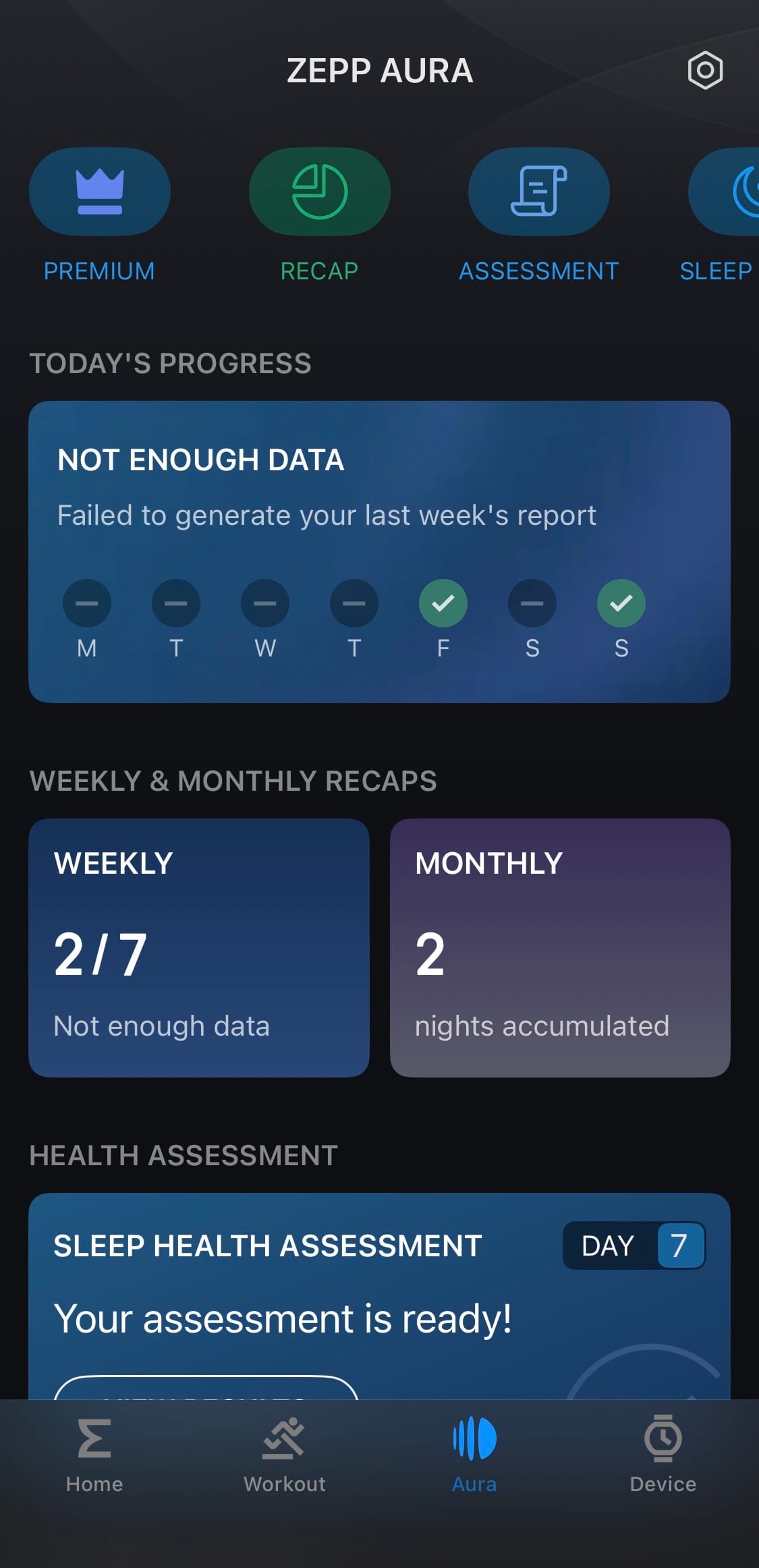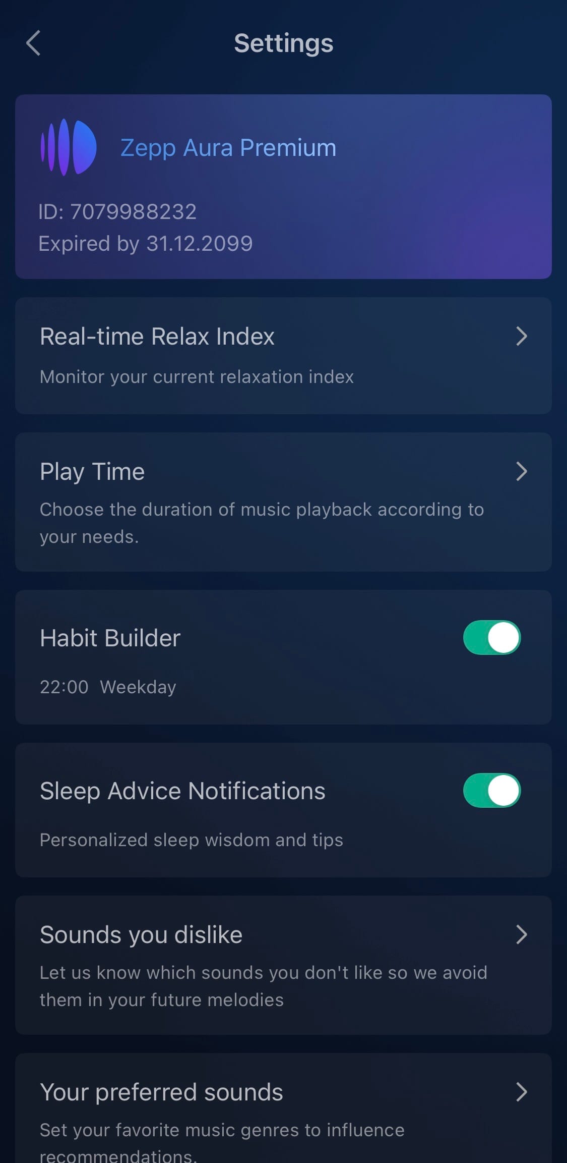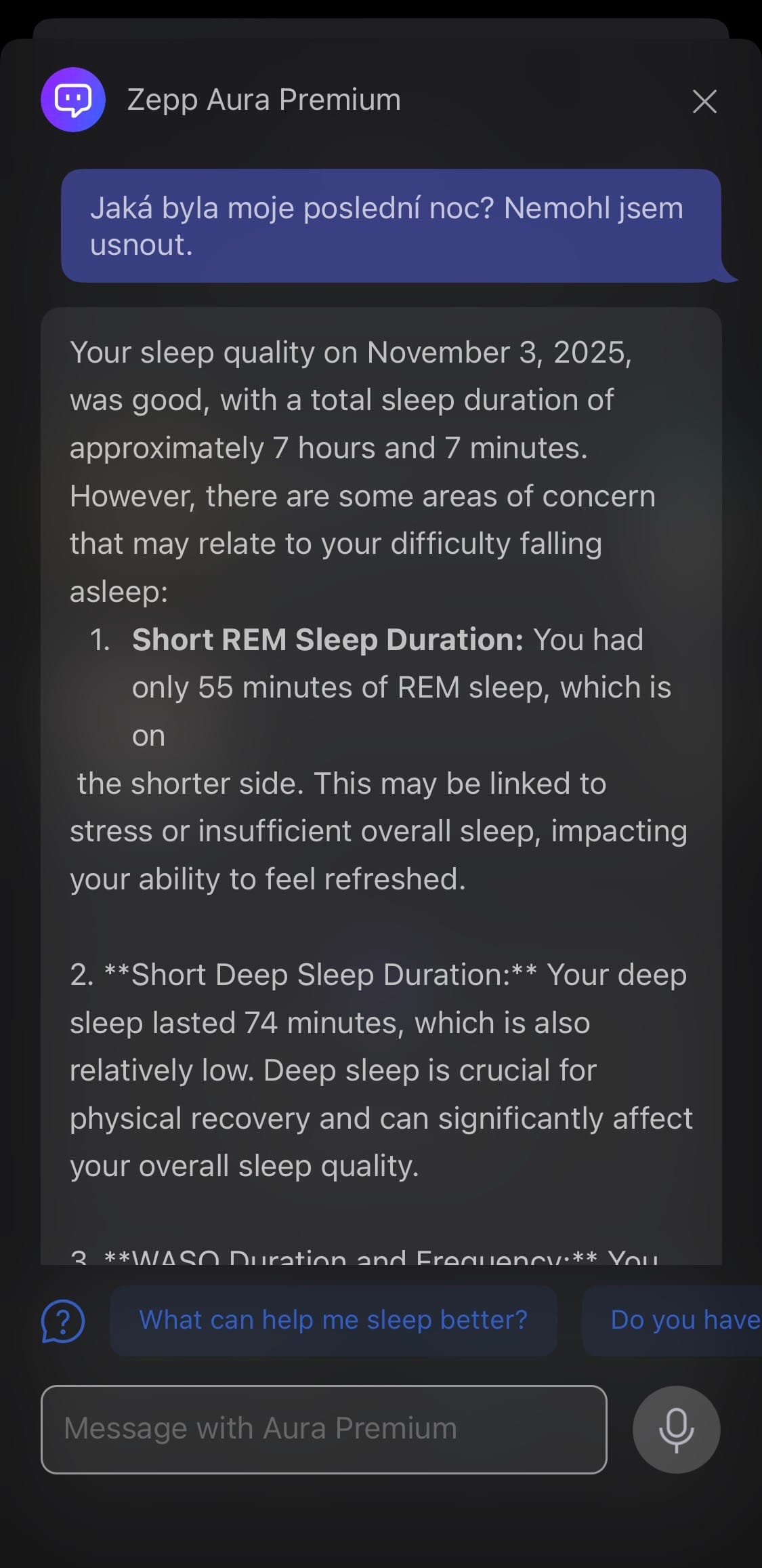 - Zepp Aura – nabízí např. AI chatbot pro wellness, personalizované zvuky pro spánek a detailní týdenní/měsíční zprávy o spánku. Běžně předplatné stojí obvykle 69 USD/rok.
