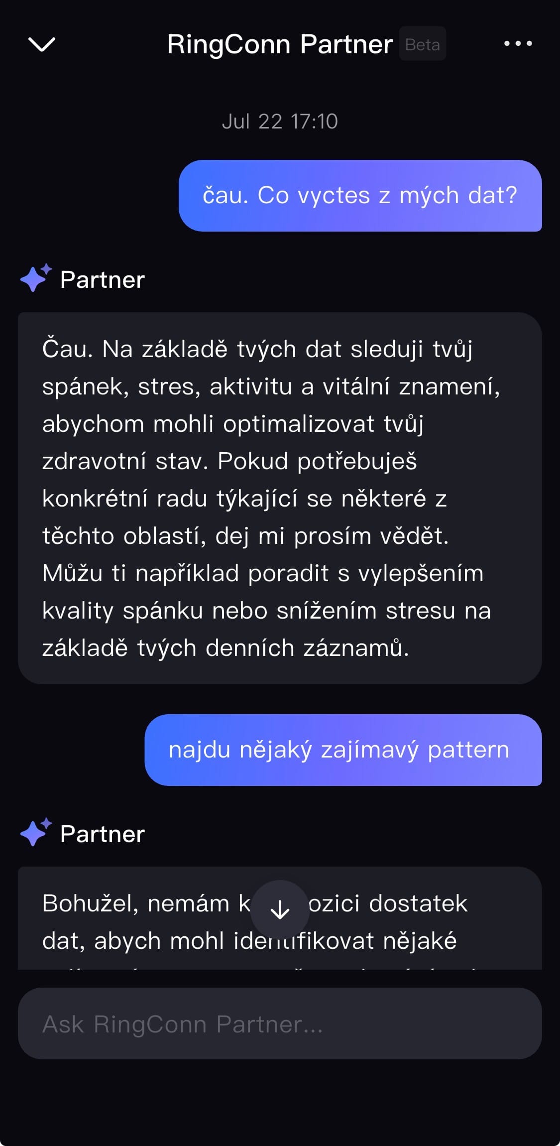 RingConn testuje svého (Beta) chatbota "RingConn Partner" v rámci "RingConn Lab" (obojí notně evokuje inspiraci u Oura). Partner umí odpovídat česky a vidí na data za posledních 30 dní.