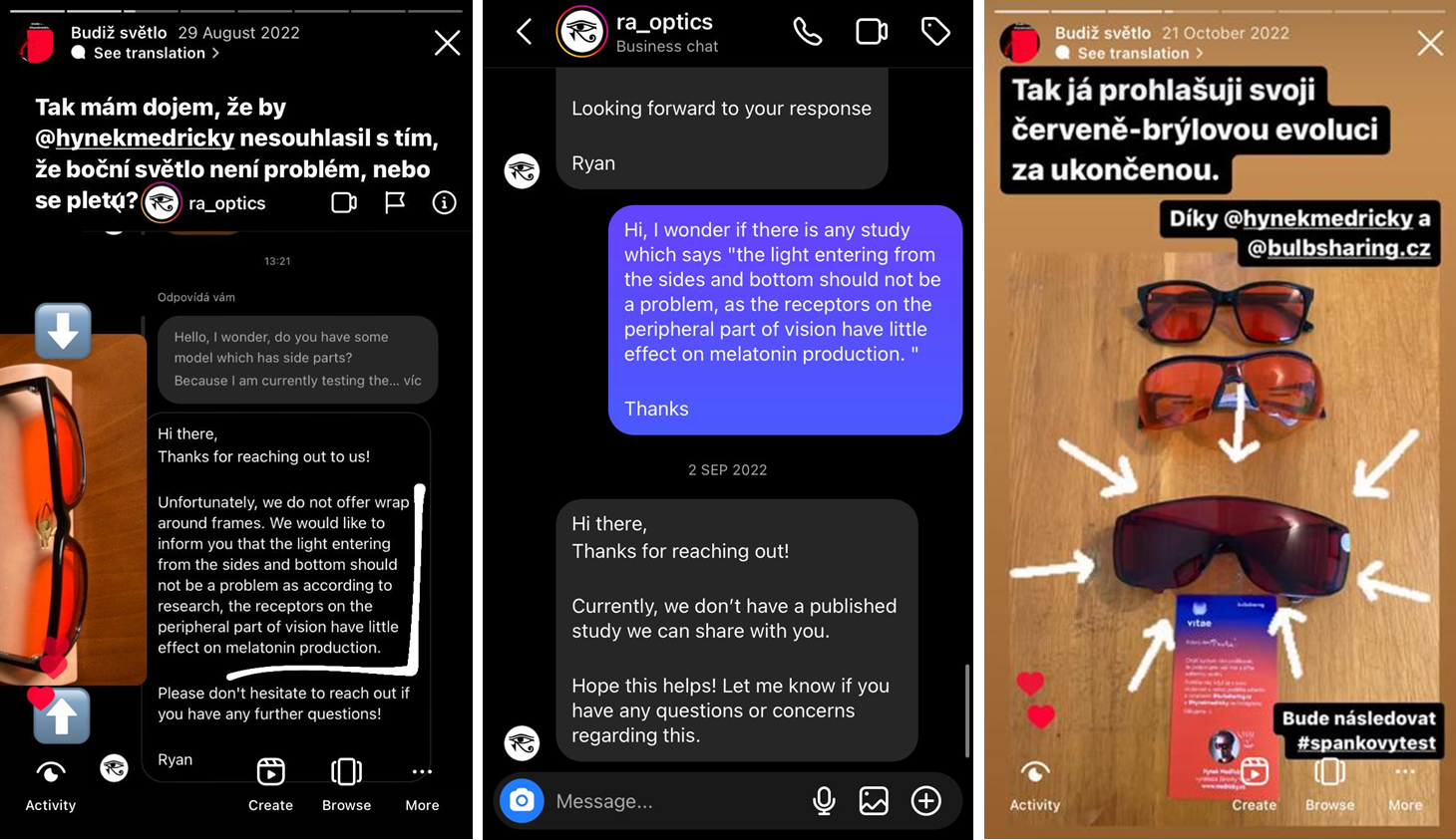 Samozřejmě, jsou fešnější než tyhlety od Hynka Medřického. Ale buď se v takové večerní rutině soustředíte na to jak vám to sekne, nebo čistě na funkčnost. Tyhlety brýle totiž chrání i strany, odkud se to světlo přirozeně do oka také dostane. Vtipné mi přišlo, že jsem výrobce konfrontoval s dotazem ohledně pronikání světla z boku a bylo mi řečeno, že světlo z boku by podle "výzkumu" nemělo být problém. Když jsem se ptal dál, podle jakého výzkumu... tak vlastně žádného...
