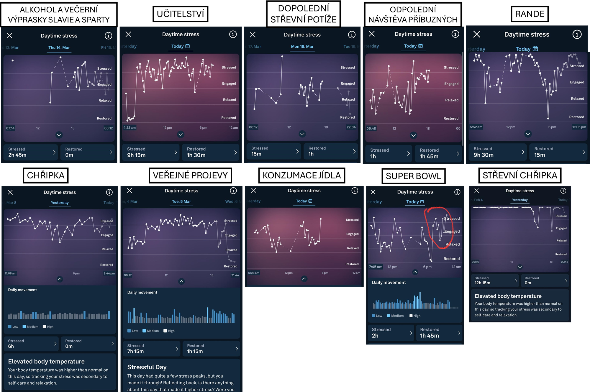 Já si prošel velkou spoustou příspěvků na redditu, kde se autoři vesměs shodují, že ta denní křivka stresu koreluje s tím, co během dne probíhalo. Pojďme si to uvést na příkladech.