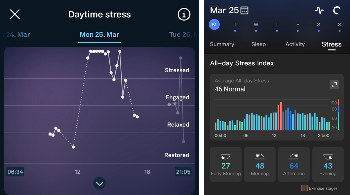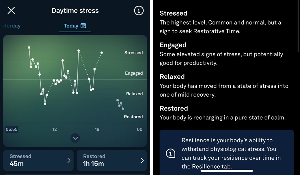 Daytime stress je založen na měření denního stresu na základě HR & HRV & teploty (a potažmo pohybu) a výsledky jsou interpretovány ve 4 úrovních: