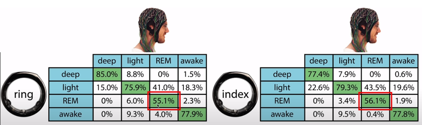 Nejobtížnější fáze na určení je ne-překvapivě REM, kterou Oura nejčastěji zaměňovala za lehký spánek. Pro REM fázi jsou totiž charakteristické rysy, které není z principu schopen chytrá prsten zajistit - zvýšená aktivita mozku a zrychlený pohyb očí.