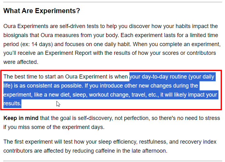 Jeden z velmi zajímavých updatů poslední doby se jmenuje Experiments. Aktuálně je uvolněn experiment s kávou. Jednoduše řečeno, Oura se vás ve 14-denním období ptá, zda jste včera měli kávu do 6 před zahájením spánku.