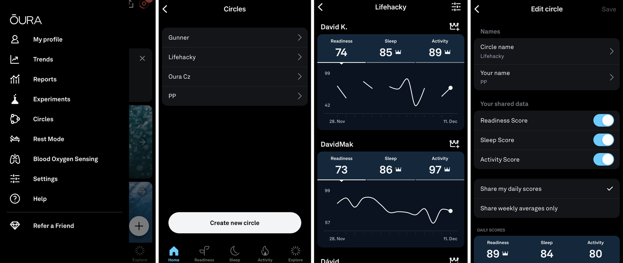 Circles jsou docela jednoduchá funkcionalita skrze kterou můžete sdílet 3 hlavní metriky tj. Readiness, Sleep a Activity s přáteli.